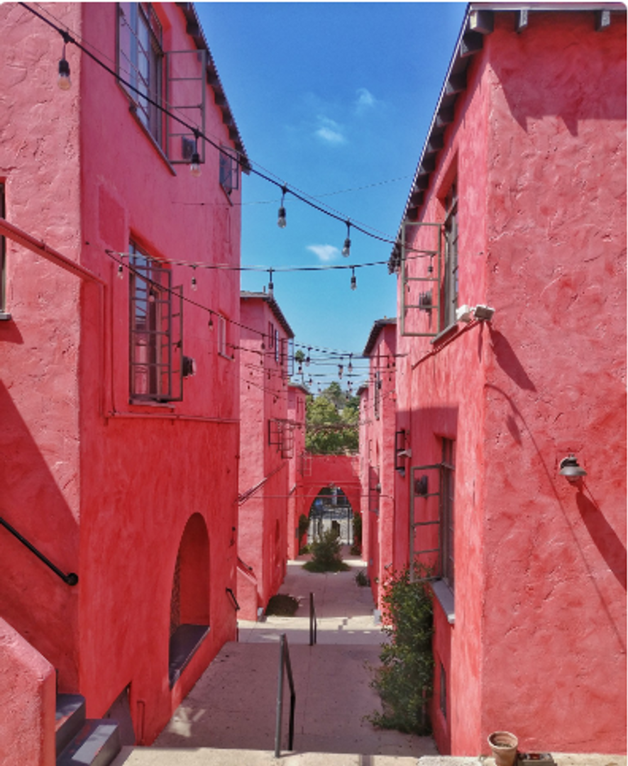 Driving up to this property you can't help but smile, the iconic exterior color jumps out and lends itself to the most Instagram-able moments. As you walk off the street you'll be transported into a world with a Mediterranean street vibe. Custom mosaic tiles inlaid into the buildings, luscious succulents, and romantic, overhead string lights -an entrance to remember! It's a magical and dreamy interior with original built-ins throughout the home.